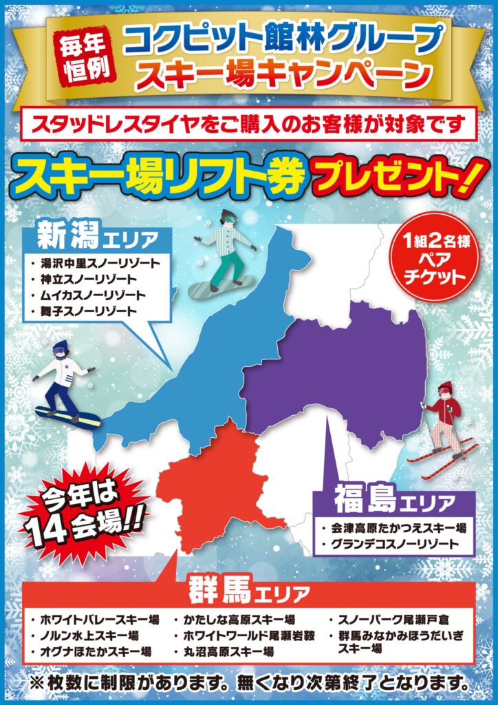 毎年恒例!コクピット館林スキー場キャンペーン 2025 12/01 補足:シーズン中にスタッドレスタイヤ4本ご購入のお客様に1組2名様リフト券プレゼント対象店舗:コクピット館林、タイヤ館館林、オートレット太田 お知らせ コクピット館林 2025.11.8・9 ブリッド着座体感フェア開催のお知らせ! 歳末大売出しセール情報のお知らせ 関連記事 COCKPIT TATEBAYASHI 2026年2月1日受注分よりオリジナルパーツ値上致します。 2026年1月8日 年末年始休業のご案内 2025年12月23日 定休日変更のお知らせ 2025年12月23日 歳末大売出しセール情報のお知らせ 2025年12月23日 2025.11.8・9 ブリッド着座体感フェア開催のお知らせ! 2025年11月4日 ストリートカスタマイズフェア開催のお知らせ! 2025年9月24日 全店休業のお知らせ 2025年9月1日 夏季休業のお知らせ 2025年8月12日